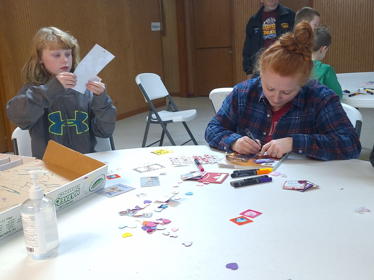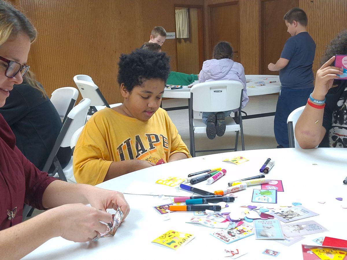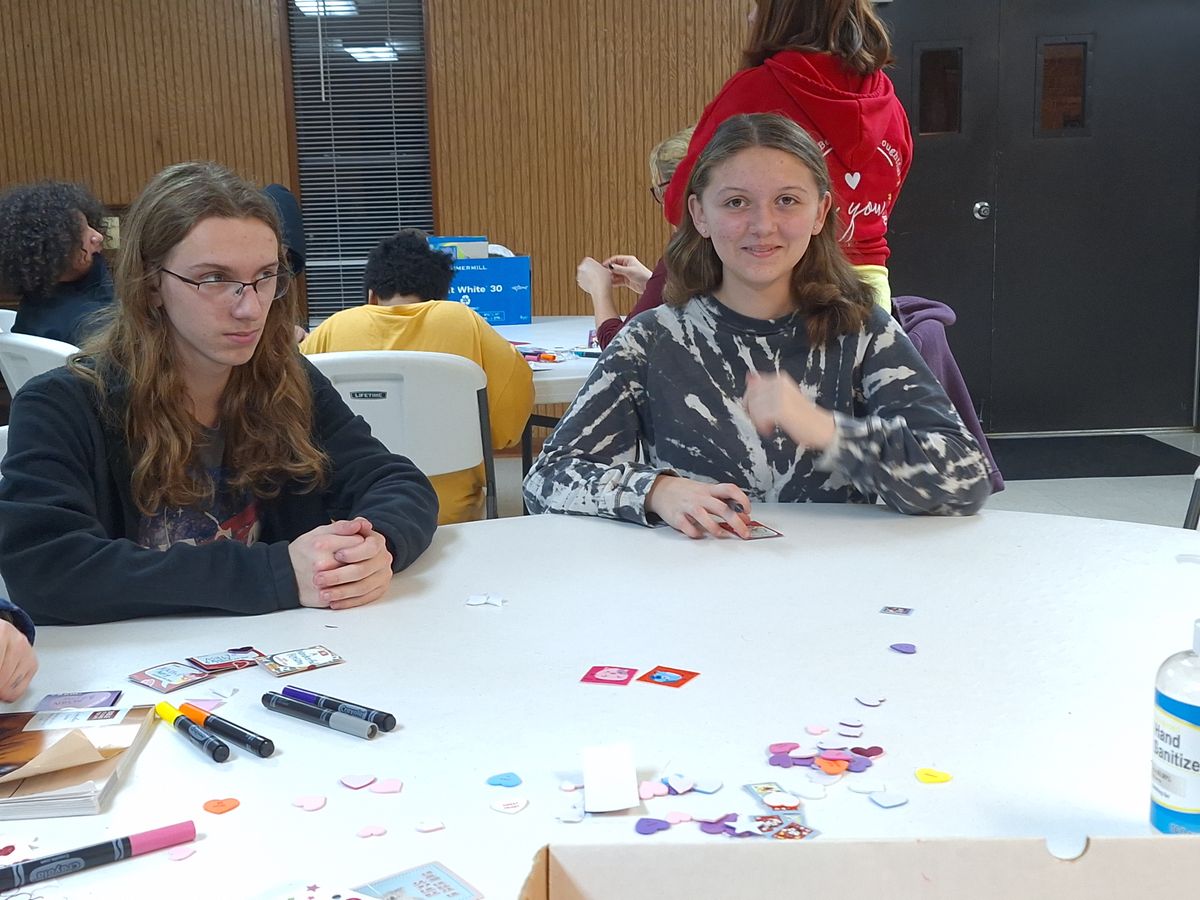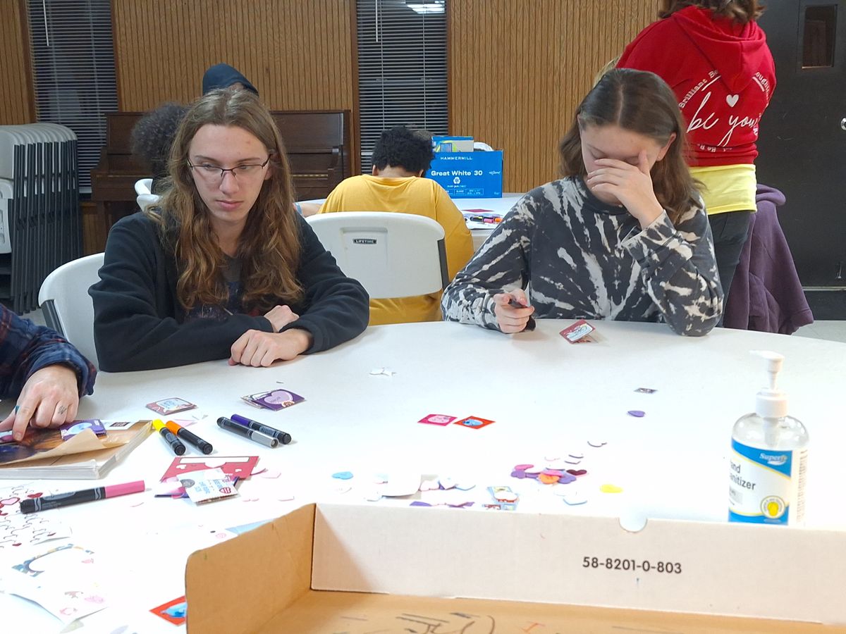 Making Valentine's Day cards for nursing home residents in 2024.