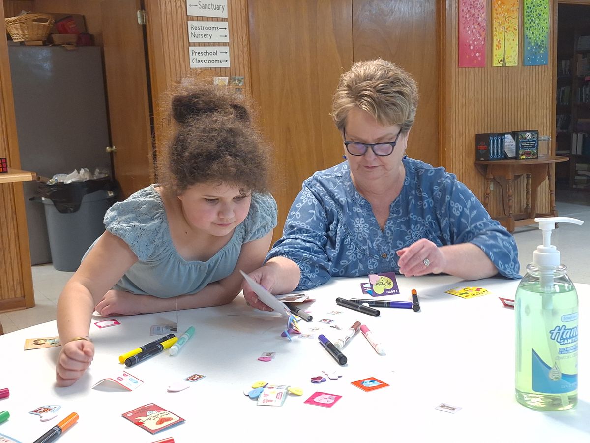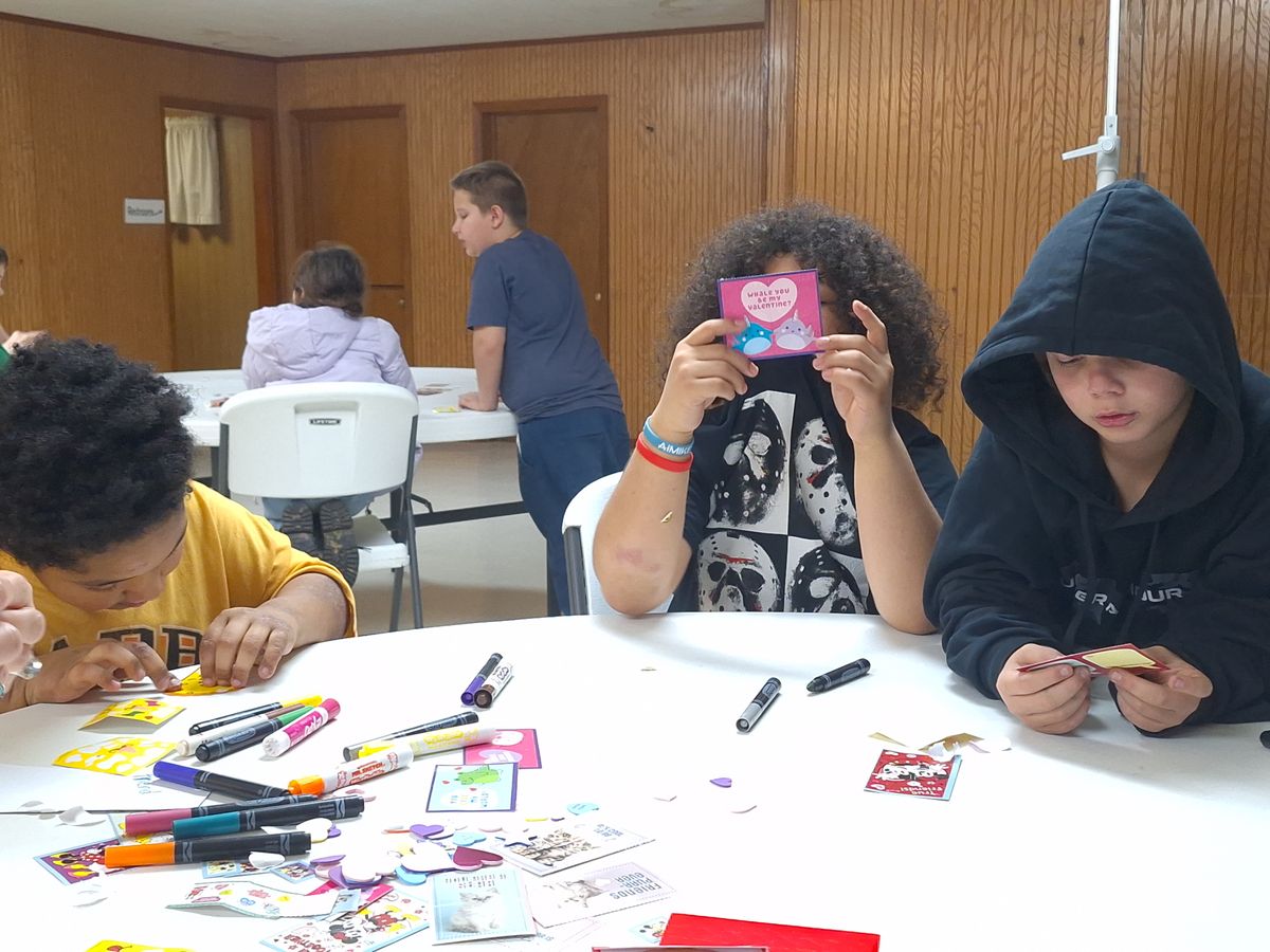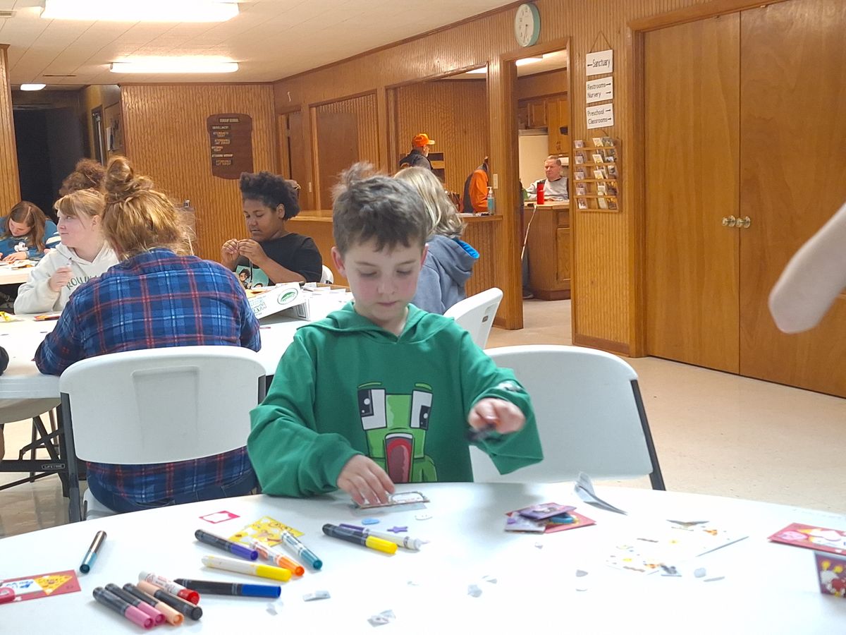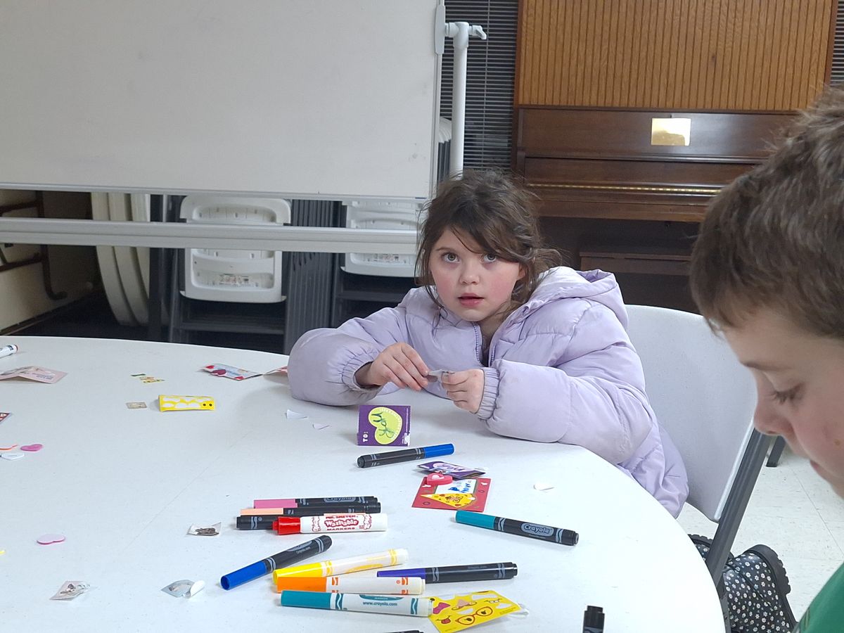 Making Valentine's Day cards for nursing home residents in 2024.